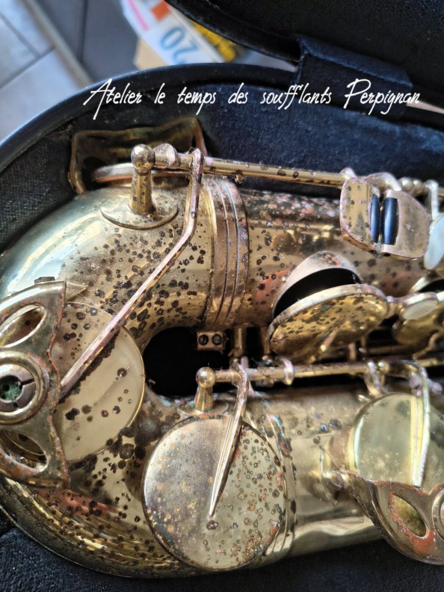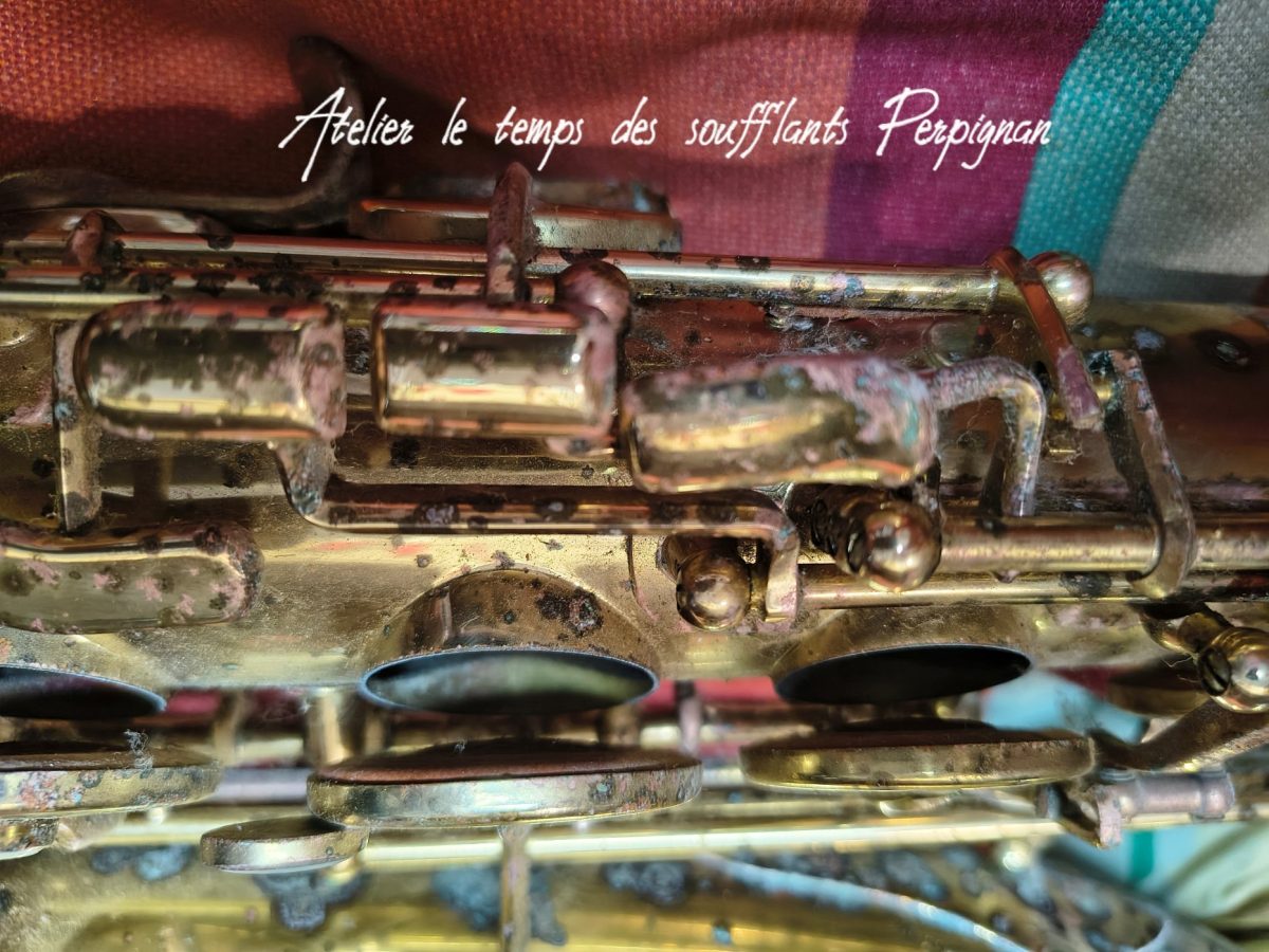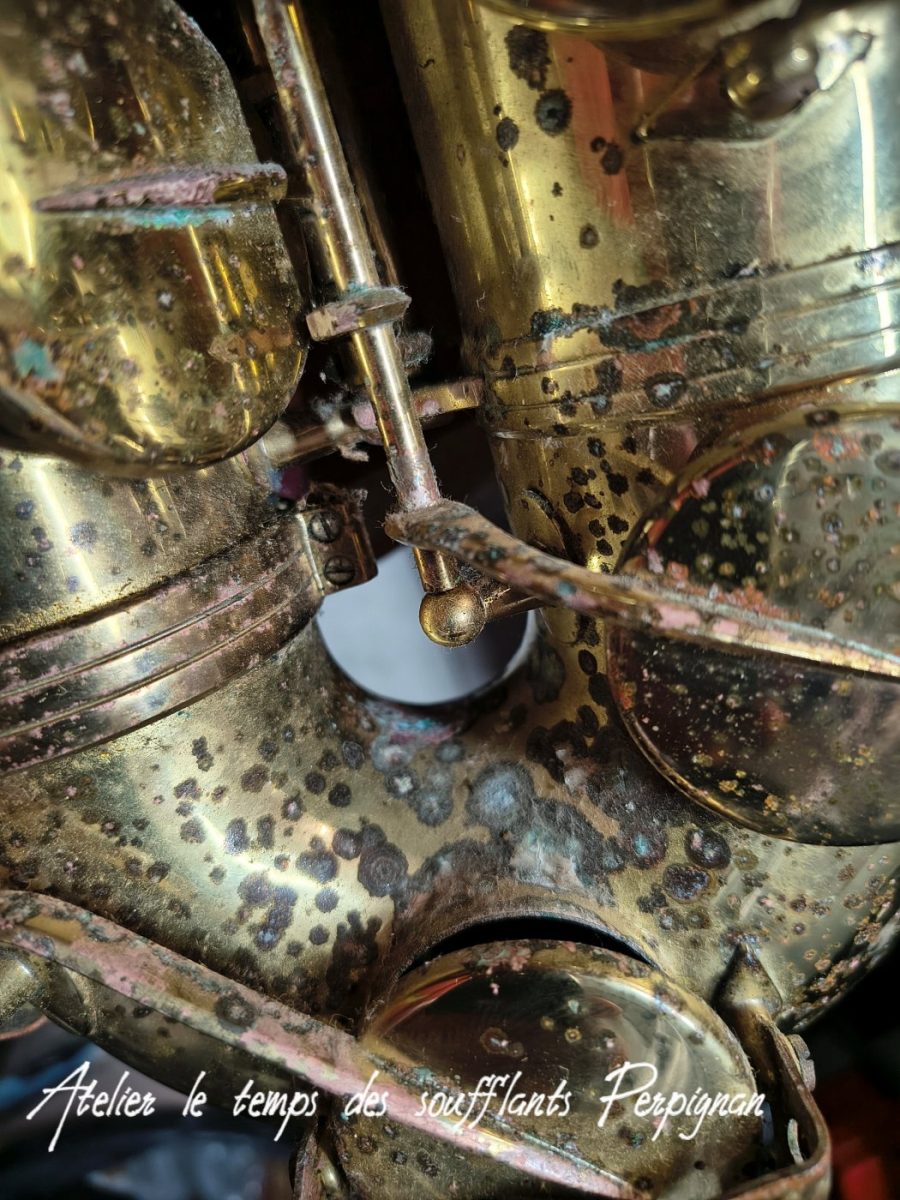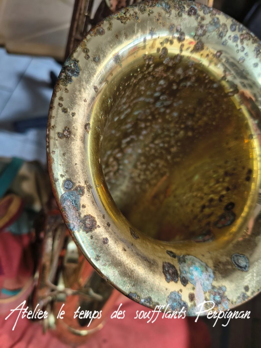 Pour la petite histoire, cet instrument très peu joué, est resté entreposé dans une cave humide près de 25 ans après le décès de son propriétaire. Il est particulièrement oxydé, les tampons sont moisis, il y a un petit « poc » juste au dessus de l’emboitement pavillon sur culasse. Aucun jeu mécanique, et malgré l’humidité pas d’axes bloqués.