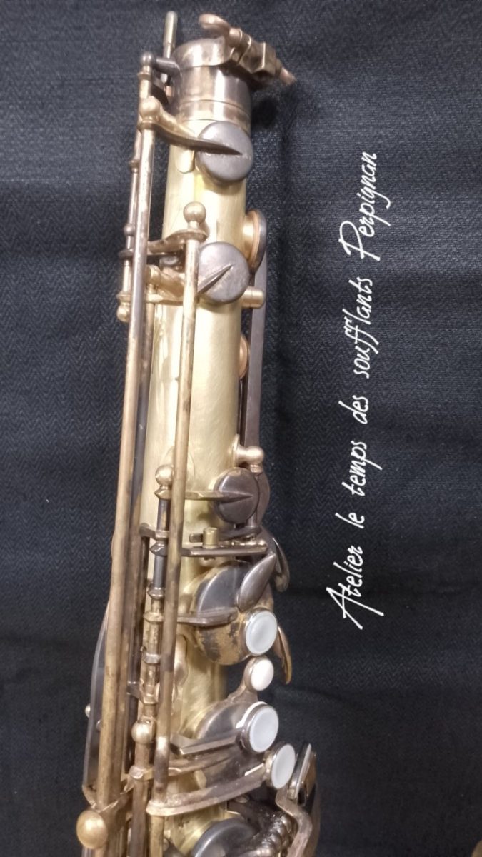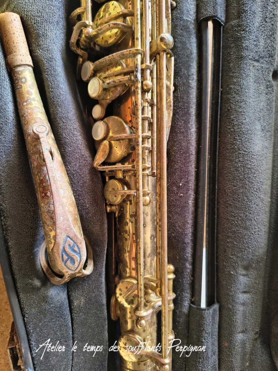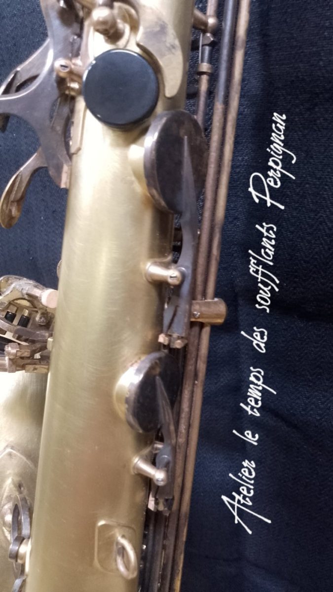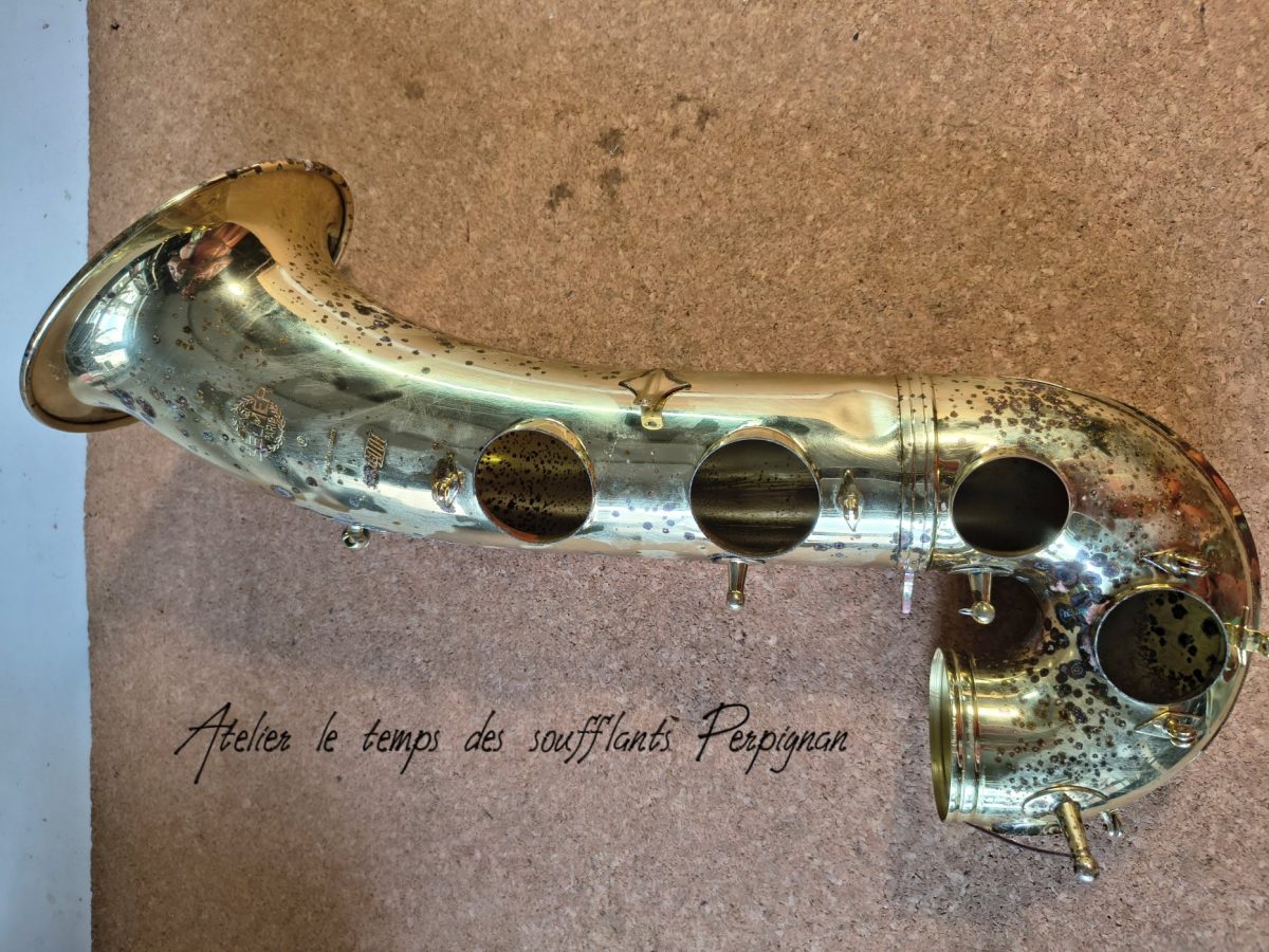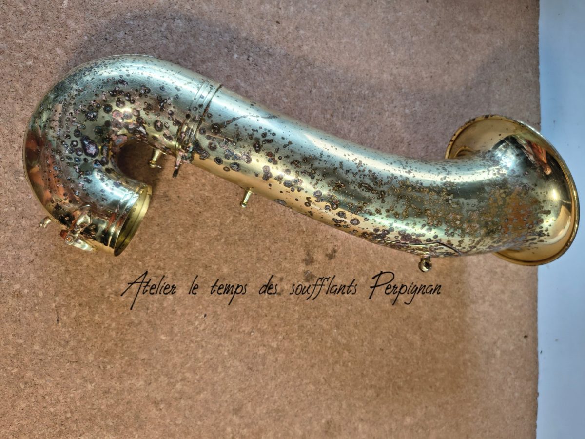 Pour la petite histoire, cet instrument très peu joué, est resté entreposé dans une cave humide près de 25 ans après le décès de son propriétaire. Il est particulièrement oxydé, les tampons sont moisis, il y a un petit « poc » juste au dessus de l’emboitement pavillon sur culasse. Aucun jeu mécanique, et malgré l’humidité pas d’axes bloqués.