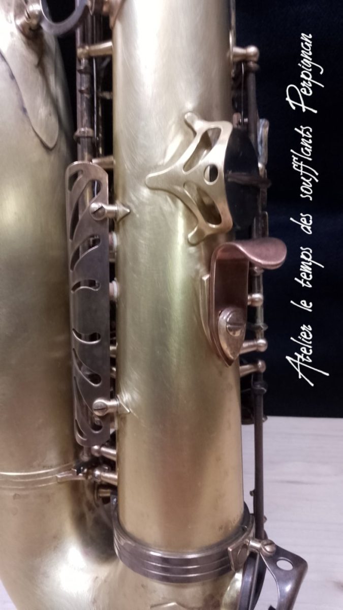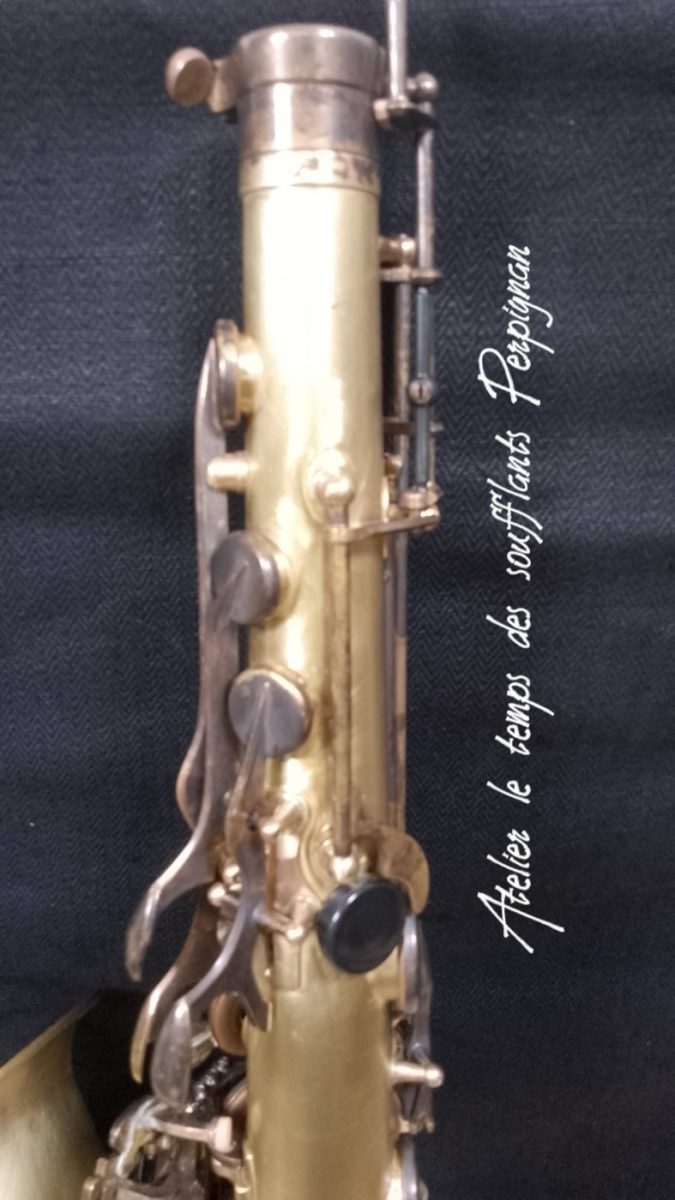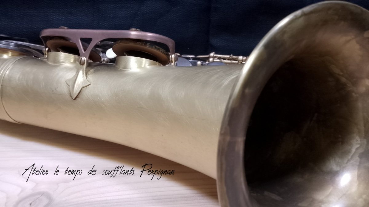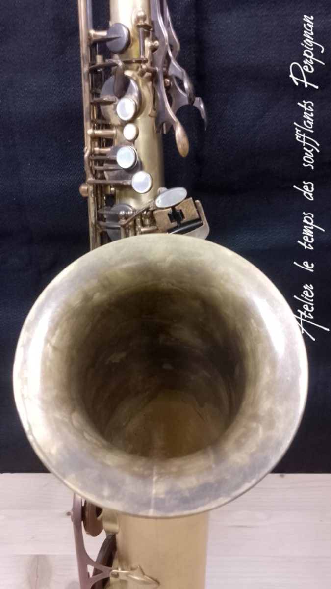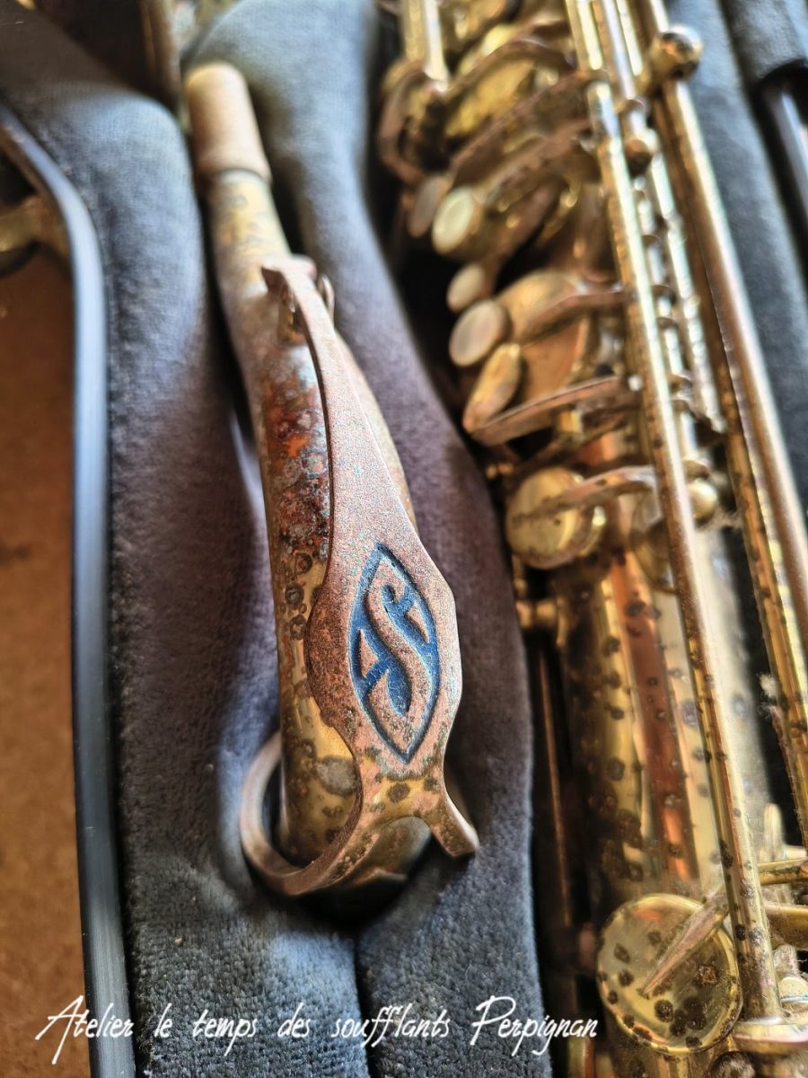 Pour la petite histoire, cet instrument très peu joué, est resté entreposé dans une cave humide près de 25 ans après le décès de son propriétaire. Il est particulièrement oxydé, les tampons sont moisis, il y a un petit « poc » juste au dessus de l’emboitement pavillon sur culasse. Aucun jeu mécanique, et malgré l’humidité pas d’axes bloqués.