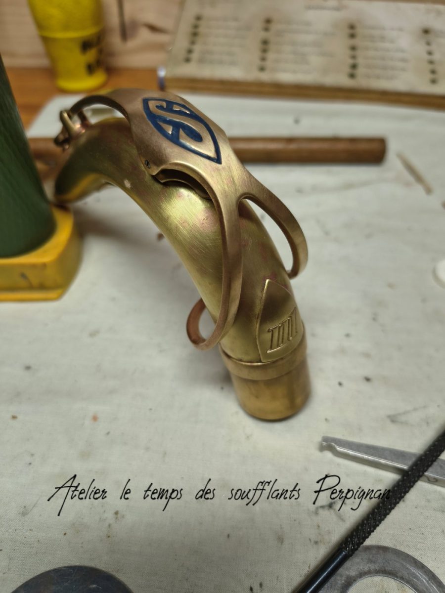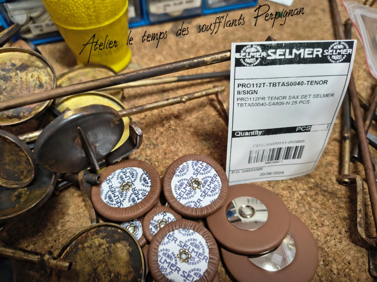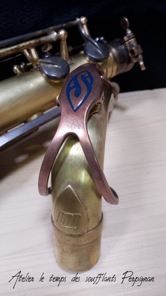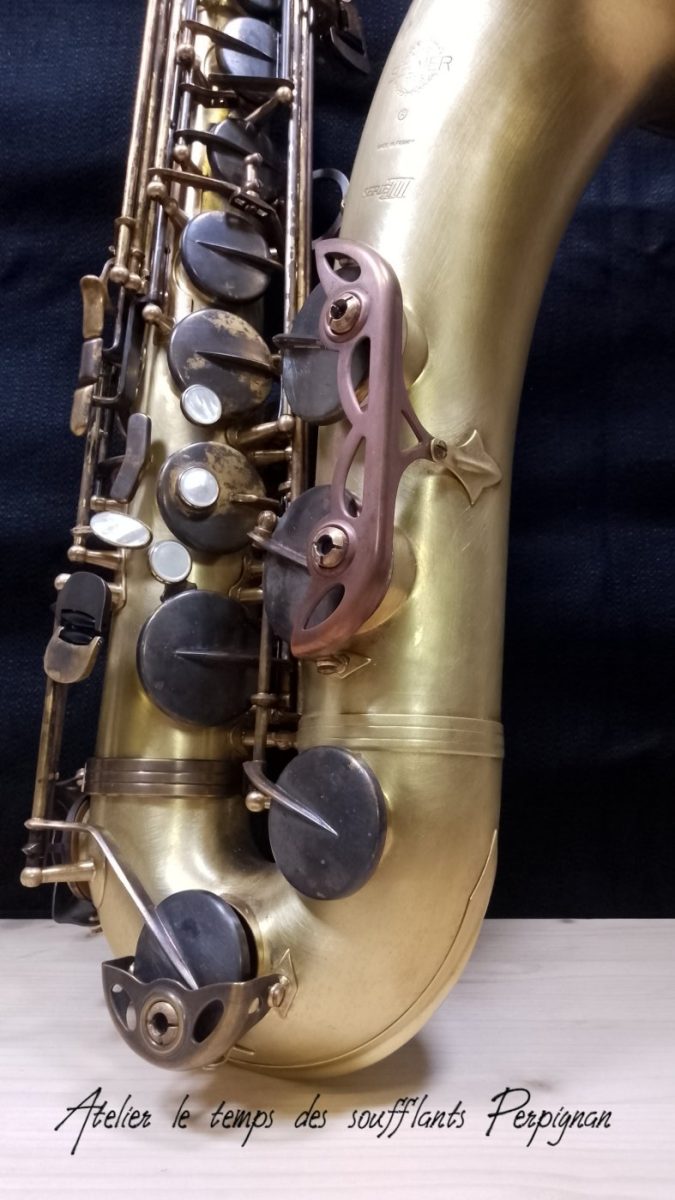 Devenu le nouveau propriétaire de ce saxophone ténor SELMER SA80 série III, je décide pour sa restauration de le dévernir, de le brosser, et de patiner le clétage et les gardes. Il sera retamponné avec les tampons cuir marron résonateurs métal de chez SELMER.